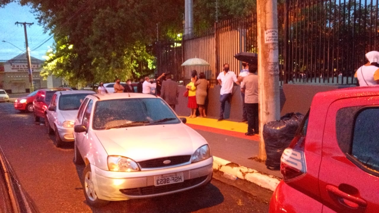 Segundo fontes, há uma fila em frente ao templo. Chove no local e os fieis “se viram” para se protegerem da chuva, já que são impedidos de entrar na igreja.