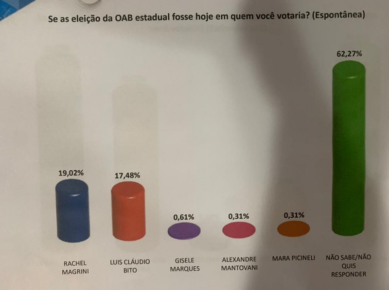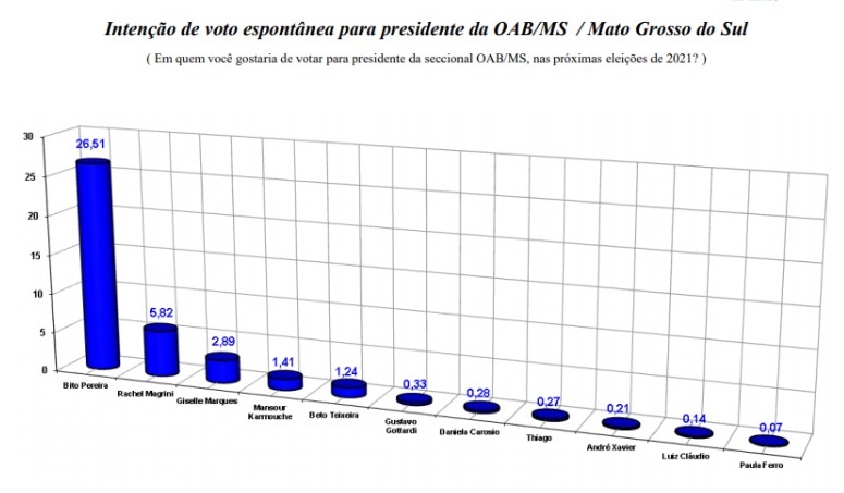 Na pesquisa espontânea, sem que haja menção aos candidatos, Bito Pereira teria 26,51% das intenções de voto. Já a segunda colocação seria Rachel Magrini, que teria apenas 5,82%. Giselle Marques ficaria em terceiro com 2,89% das intenções de voto dos advogados sul-mato-grossenses, além dos 60,82% dos participantes não sabem ou não opinaram.