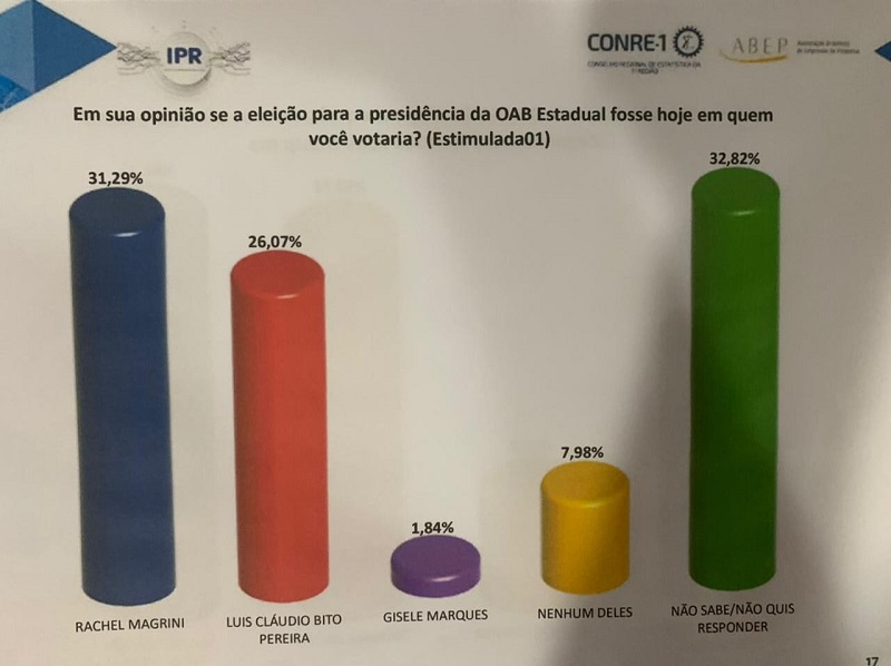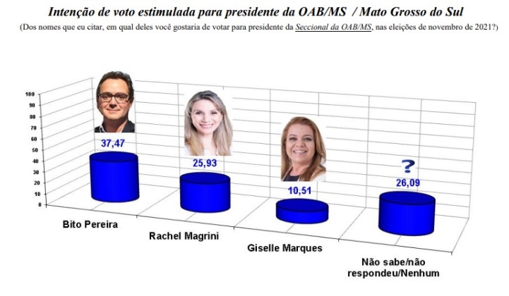 Dados de dois levantamentos realizados pelo Instituto de Pesquisas de Mato Grosso do Sul (Ipems), e Instituto de Pesquisa Resultado (IPR), divergem sobre quem pode ser o próximo presidente (a) da Ordem dos Advogados do Brasil, seccional de Mato Grosso do Sul (OAB-MS). As diferentes pesquisas mostram os pré-candidatos Bito Pereira e Rachel Magrini liderando a disputa.