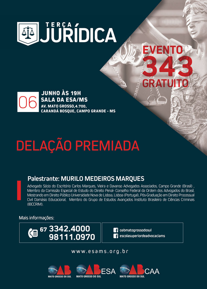A Escola Superior de Advocacia De Mato Grosso do Sul (ESA/MS) realiza na noite da próxima terça-feira (06) palestra gratuita sobre “Delação Premiada”. O evento faz parte do programa Terça Jurídica e começa às 19 horas.