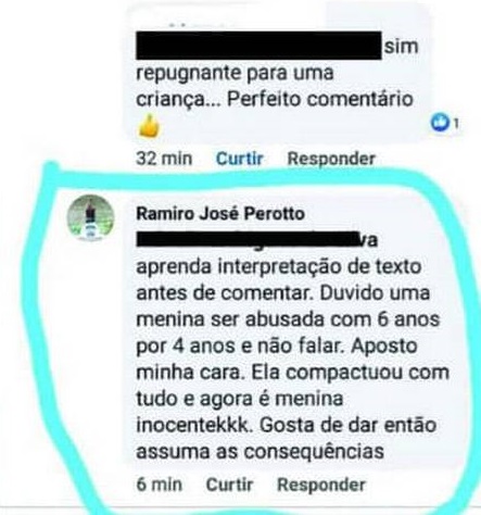"Vá defender isso em outro lugar. Você acredita que a menina é inocente? Acredita em papai noel também? 6 anos, por 4 anos e não disse nada. Claro que tava gostando. Por favor kkkk, gosta de dar, então assuma as consequências", escreveu ele. "Duvido uma menina ser abusada com 6 anos por quatro anos e não falar. Aposto minha cara. Ela compactuou com tudo e agora a menina é inocente kkkk. Gosta de dar, então assuma as consequências”, escreveu Ramiro.