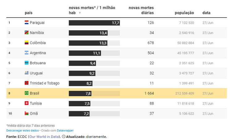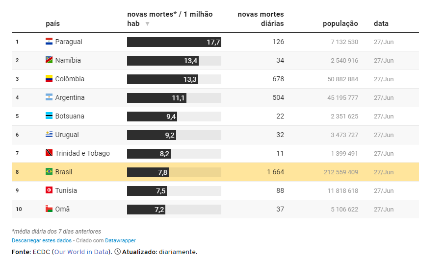 Uma forma de identificar a Covid-19 em crescimento é analisar o número de novas mortes registradas a cada dia em relação ao seu número de habitantes. Países com alto número de mortes diárias ainda não controlaram a doença. Por esse indicador, o ranking fica conforme mostra o gráfico.
