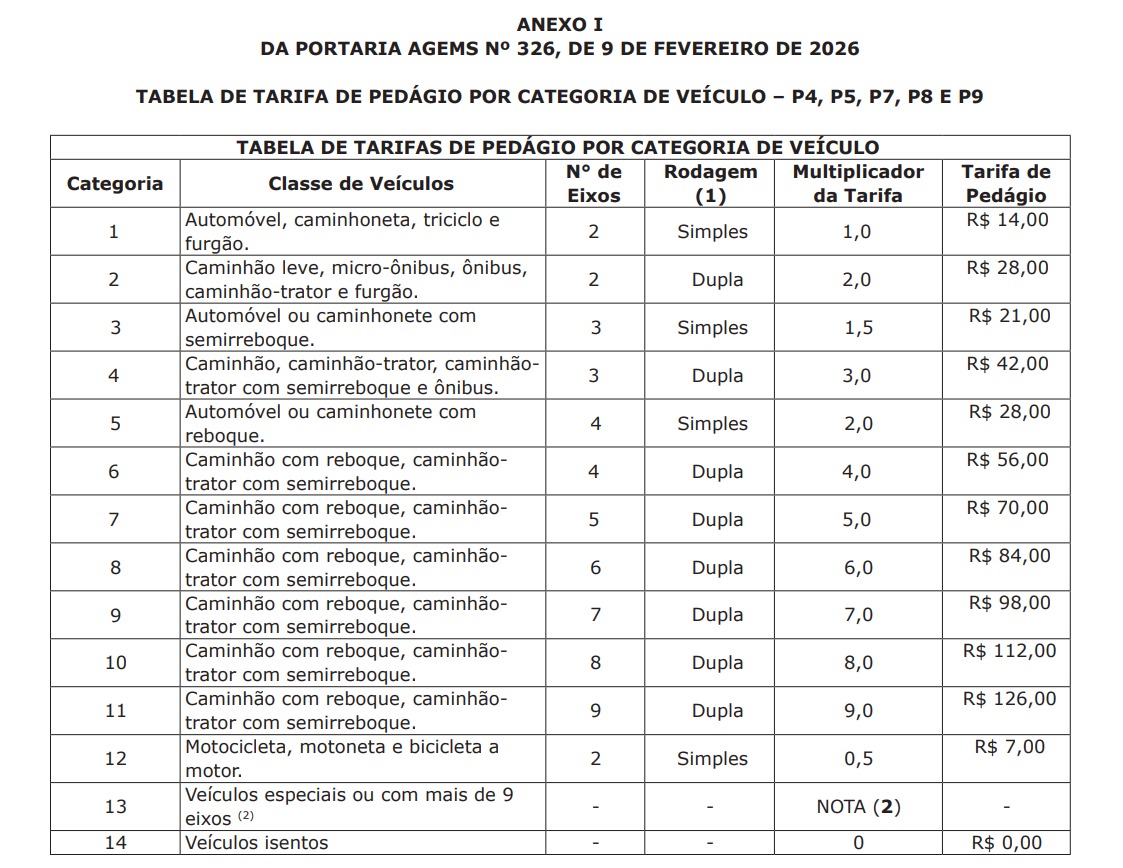 A portaria nº 326/2026 formaliza a 2ª Revisão Ordinária da Tarifa Básica de Pedágio (TBP) e o 3º Reajuste Anual da Tarifa de Pedágio (TP). Conforme o texto, a tarifa básica nas praças P4, P5, P7, P8 e P9 foi ajustada de R$ 13,50 para R$ 13,45, enquanto na praça P6 o valor passou de R$ 4,40 para R$ 4,38.