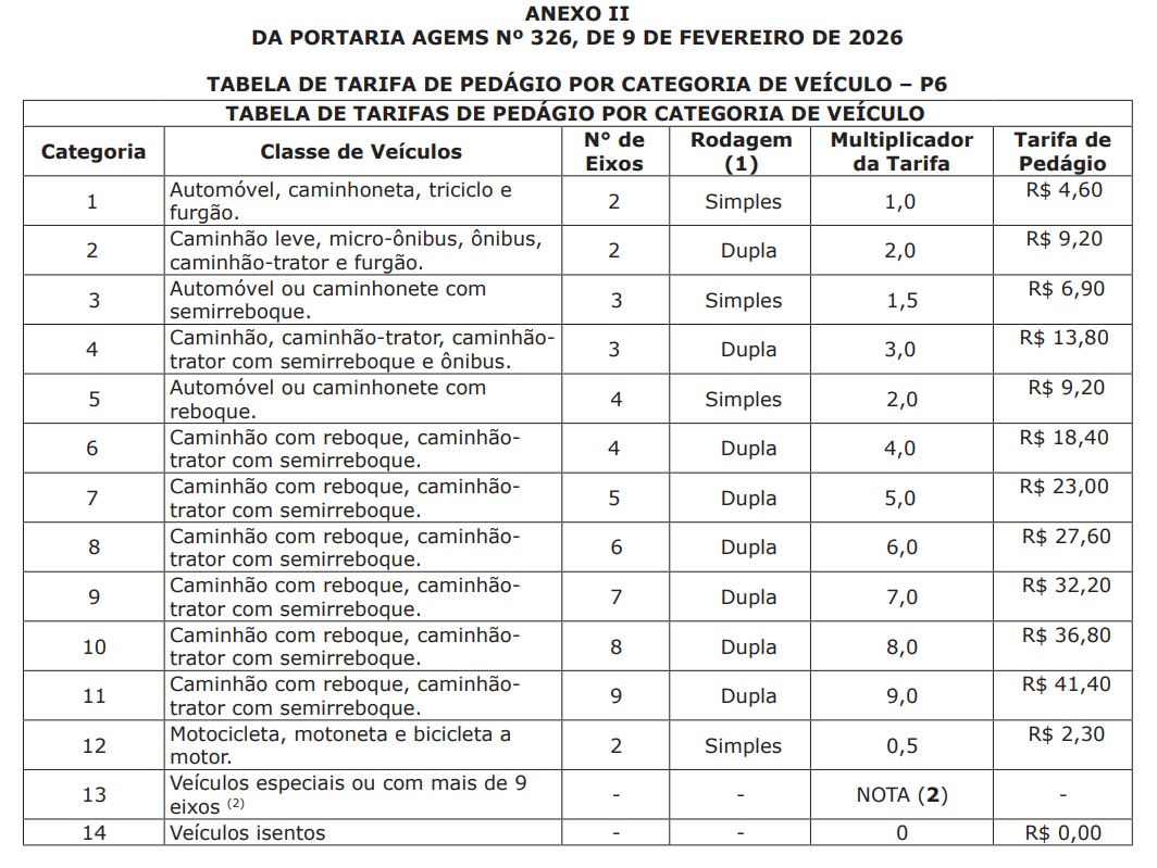 Na sequência, foi aplicado o índice de reajuste tarifário de 4,26%, correspondente à variação do IPCA no período. Com isso, a tarifa final para veículos da categoria 1, que inclui automóveis, caminhonetes, triciclos e furgões, ficou fixada em R$ 14 nas praças P4, P5, P7, P8 e P9, e em R$ 4,60 na praça P6.