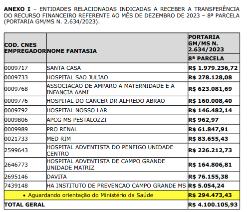 A Prefeitura de Campo Grande, sob o comando da prefeita Adriane Lopes, divulgou a lista das entidades indicadas para receber a transferência do recurso financeiro referente à oitava parcela do piso salarial da enfermagem, relativo ao mês de dezembro de 2023. A divulgação foi feita pela SESAU - Secretaria Municipal de Saúde de Campo Grande.