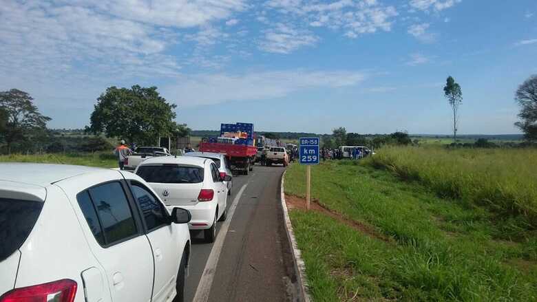 A BR 163 também foi interditada no quilometro 315, em Rio Brilhante, com pneus e madeira por cerca de 50 manifestantes sem terra com bandeira da FETAGRI.