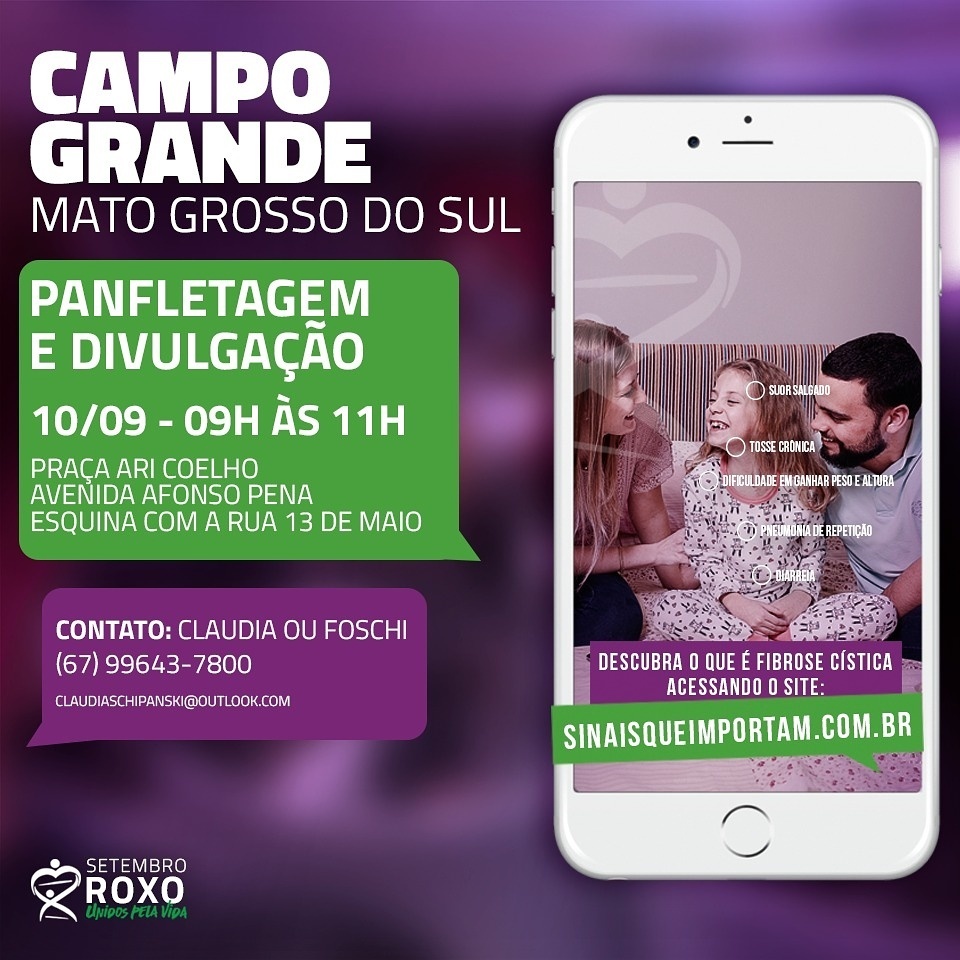 No mês de conscientização e divulgação da Fibrose Cística e sem remédios para o tratamento da doença, a Associação Sul-Mato-Grossense de Fibrose Cística (ASMFC) estará neste domingo (10), na Praça Ary Coelho, das 9h às 11h, em uma ação de panfletagem e divulgação da doença.