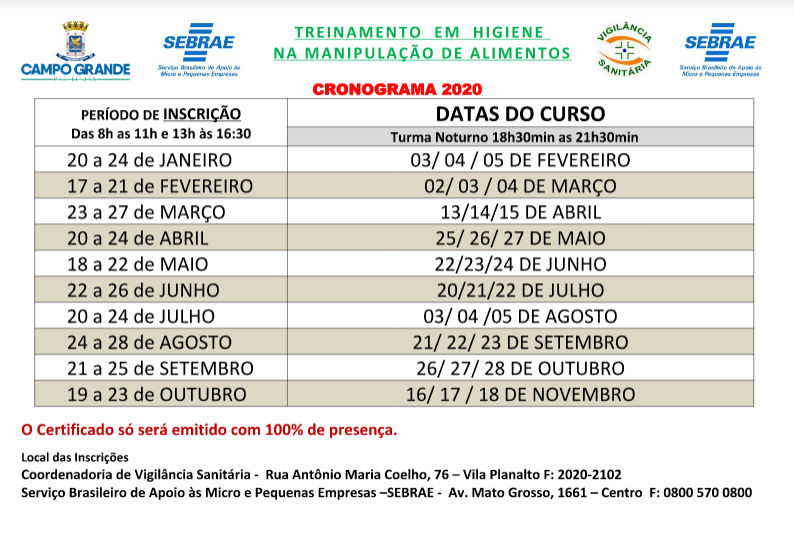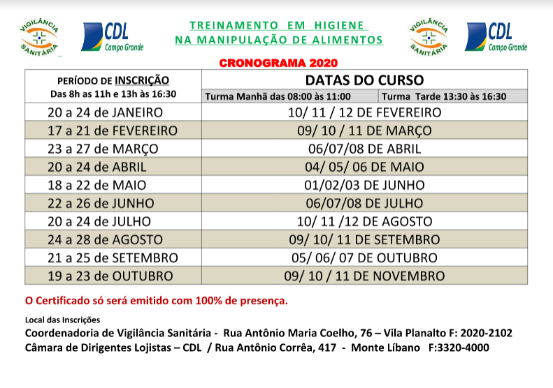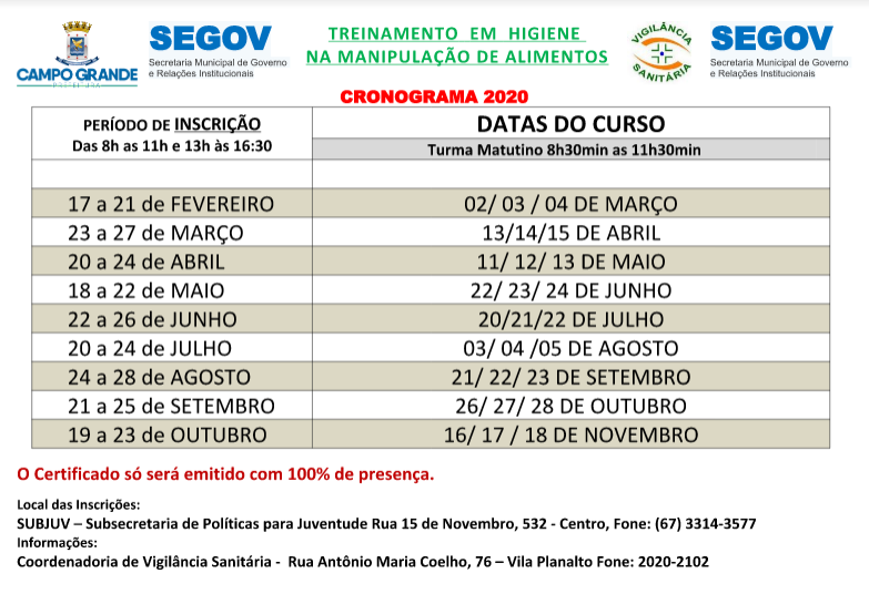 A Prefeitura de Campo Grande, por meio da Coordenadoria de Vigilância Sanitária (CVS) da Secretaria Municipal de Saúde (SESAU), inicia nesta segunda-feira (20) as inscrições para mais uma edição do “Treinamento em Higiene na Manipulação de Alimentos”.