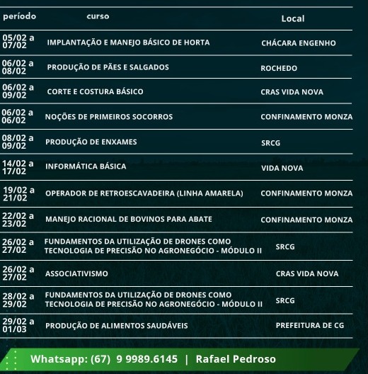 Em parceria com o Serviço Nacional de Aprendizagem Rural de Mato Grosso do Sul (Senar/MS), o Sindicato Rural de Campo Grande, Rochedo e Corguinho - SRCG, divulgou a lista de cursos gratuitos para o mês de fevereiro.