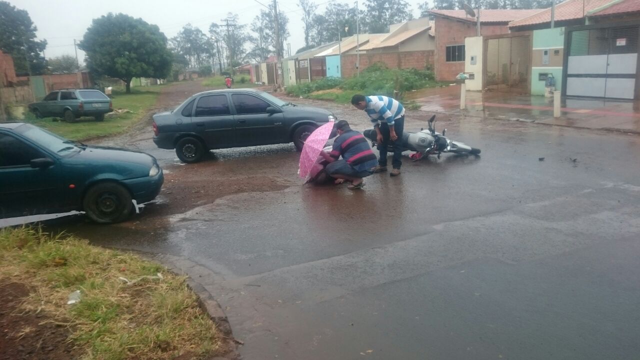 Uma motociclista ainda não identificada sofreu ferimentos após escorregar em pedras que foram colocadas para tapar um buraco na Rua 22 esquina com a Rua 28 no bairro Nova Campo Grande. O acidente que aconteceu no início da manhã causou várias escoriações.