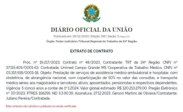 A Justiça do Trabalho em Mato Grosso do Sul, representada pelo Tribunal Regional do Trabalho da 24ª Região (TRT24), formalizou um contrato de R$ 120.213.279,00 (valor global) com a Unimed Campo Grande MS Cooperativa de Trabalho Médico, conforme divulgado no Diário Oficial da União.