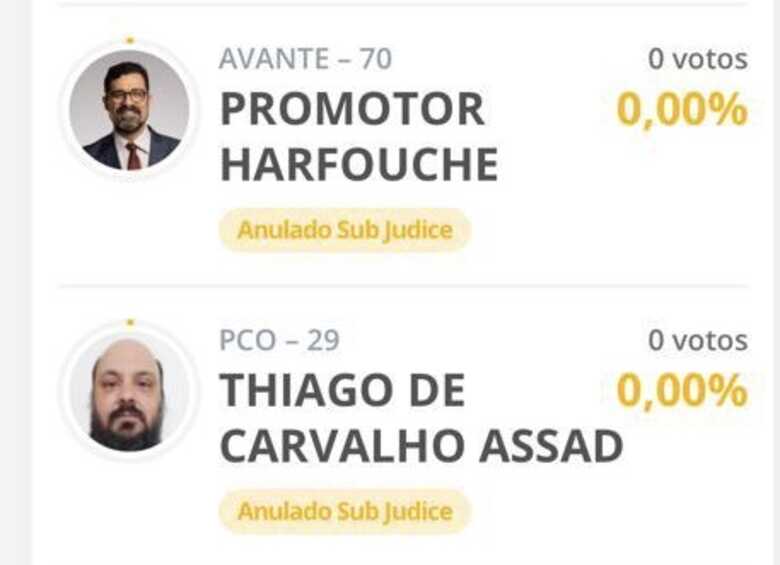 O candidato do Avante, Promotor Harfouche e o estudante Tiago Assad (PCO) aparecem no sistema de apuração de votos do Tribunal Superior Eleitoral (TSE) como “anulado sub judice”.
