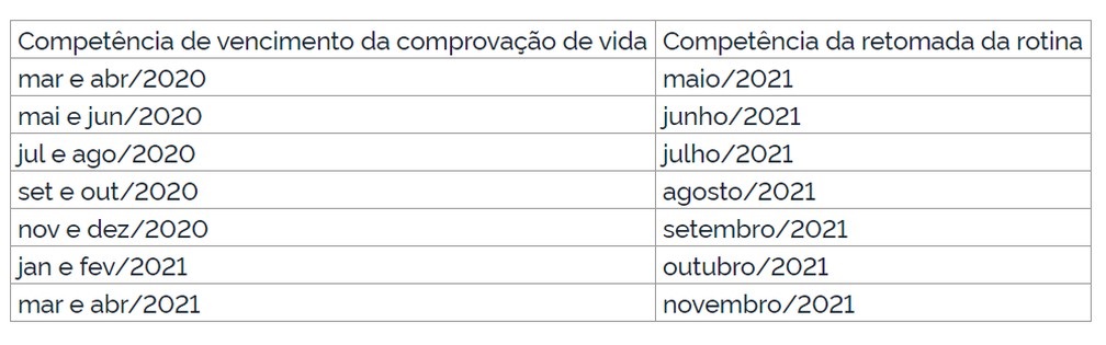 Quem faria a prova de vida em março e abril de 2020, terá de fazer em maio deste ano. Já quem tinha que provar que está vivo entre março e abril deste ano para continuar recebendo o benefício terá de fazer isso em novembro.