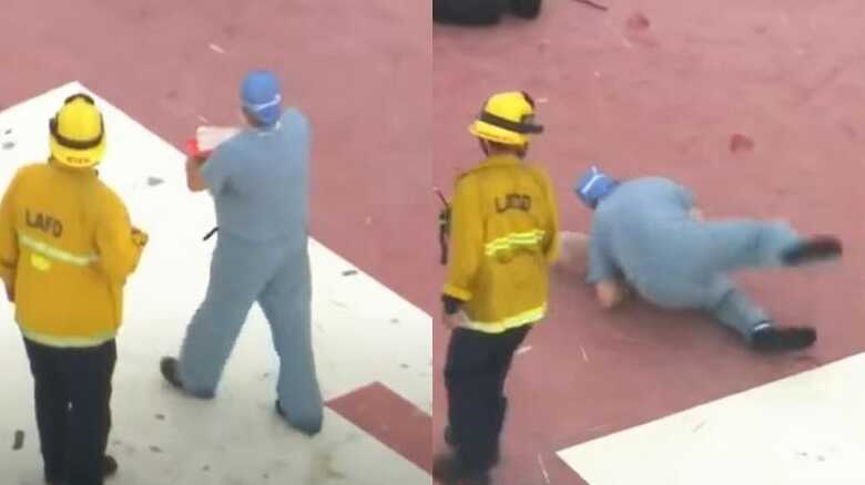 No vídeo é possivel ver o momento em que o médico acelerou o passo com o coração, tropeçou em algo no chão e foi ao solo. Ele teve de ser ajudado por bombeiros e demais pessoas que estavam no local.