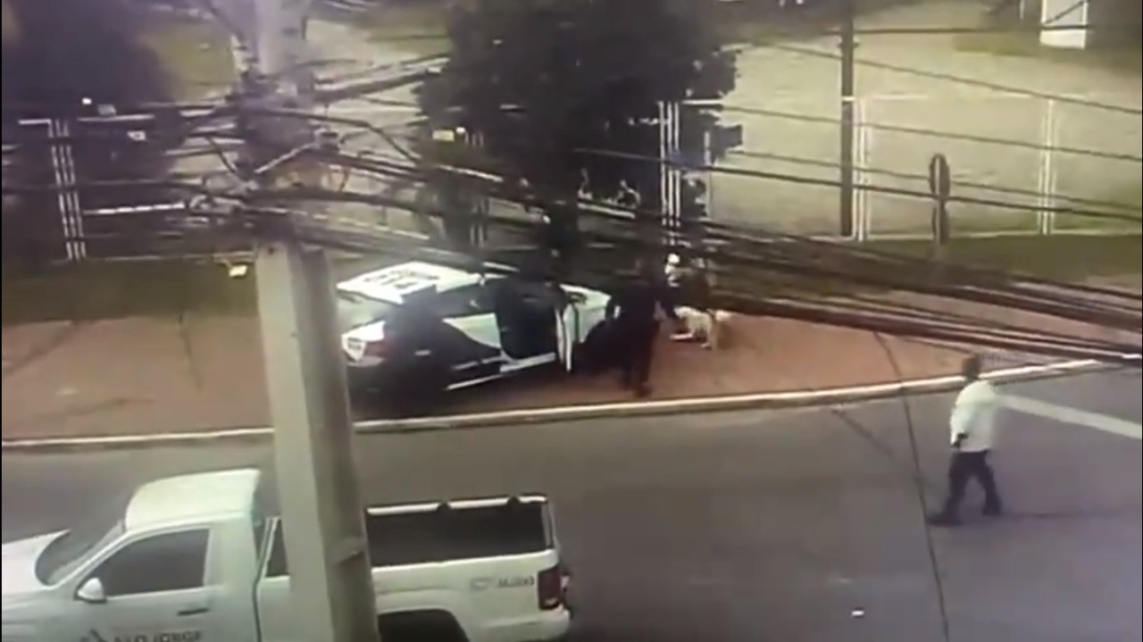 Na sequência, surge uma viatura da Guarda Municipal (GM). Os agentes chegaram no local aproximadamente 30 segundos depois do ataque do Pitbull.