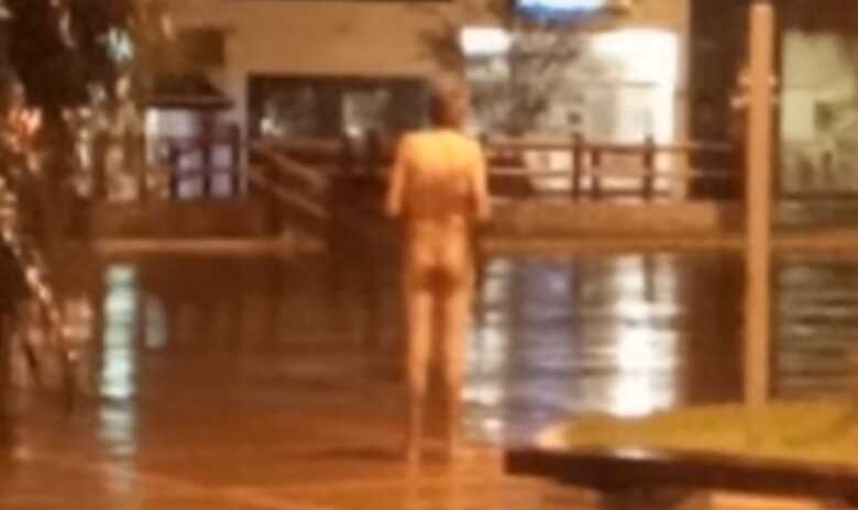 Um homem ainda não identificado foi flagrado andando nu na praça central de Sidrolândia, na noite de terça-feira (19). Como mostram as imagens gravadas por um morador, chovia no momento da filmagem.