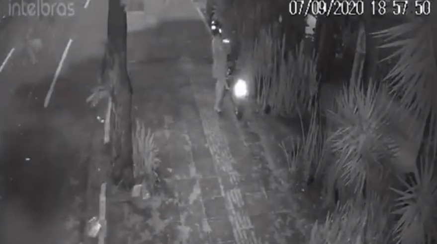 Nas imagens disponibilizadas pelo empresário Sergio Francisco Longo, é possível ver que a mulher estaciona a sua motocicleta na calçada e fica sentada num banco em frente ao local.