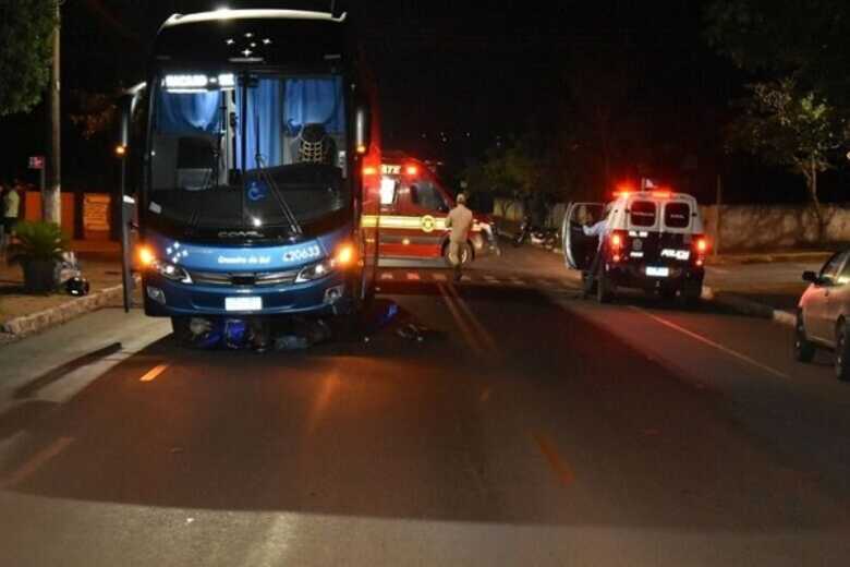 A moto ficou presa embaixo do ônibus e foi arrastada por cerca de 30 metros antes do veículo parar.