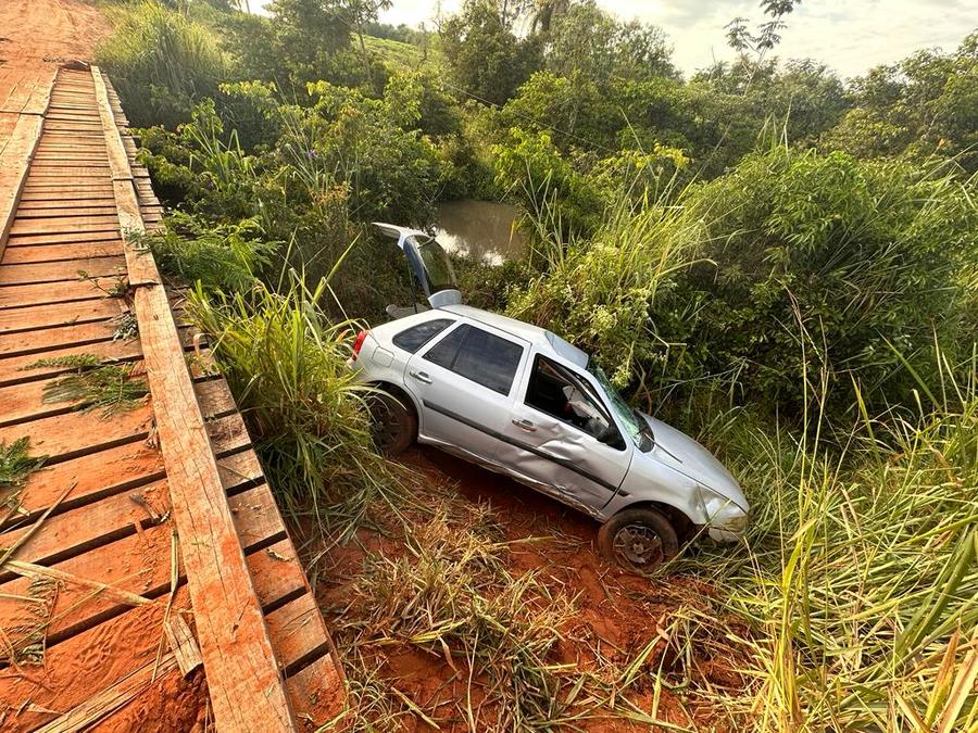 Um carro, modelo Gol, caiu da ponte após colidir com uma bicicleta, na manhã deste sábado (8), em um trecho não pavimentado da MS-134, na região do Córrego Borevi, em Batayporã.