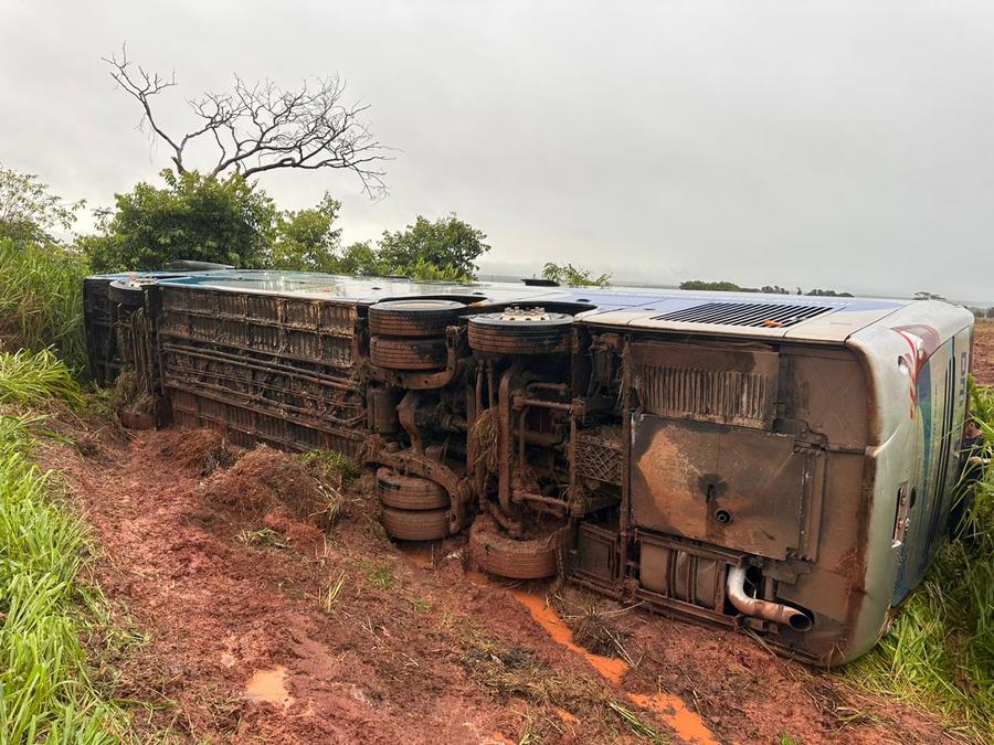 Um ônibus de viagem tombou nas primeiras horas da manhã desta sexta-feira (24) na MS-276, entre Batayporã e Anaurilândia. Ele estava com 13 passageiros a bordo.