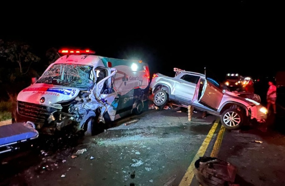 A carreta, uma das envolvidas na colisão, parou nas margens da rodovia, enquanto a ambulância e o Fiat Toro ficaram bastante danificados com o acidente.