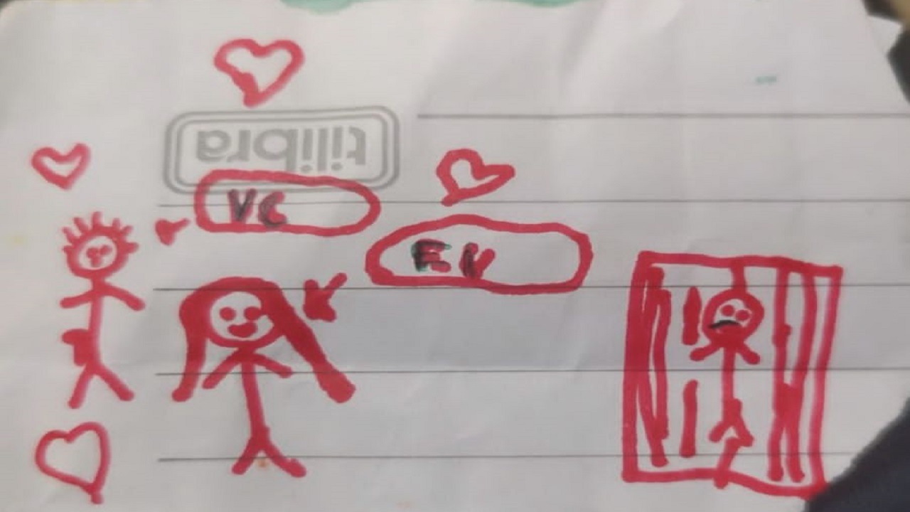 Antes de encerrarem a ocorrência, os policiais foram surpreendidos com um desenho de agradecimento por parte da criança. No papel, mostrava o suspeito preso.