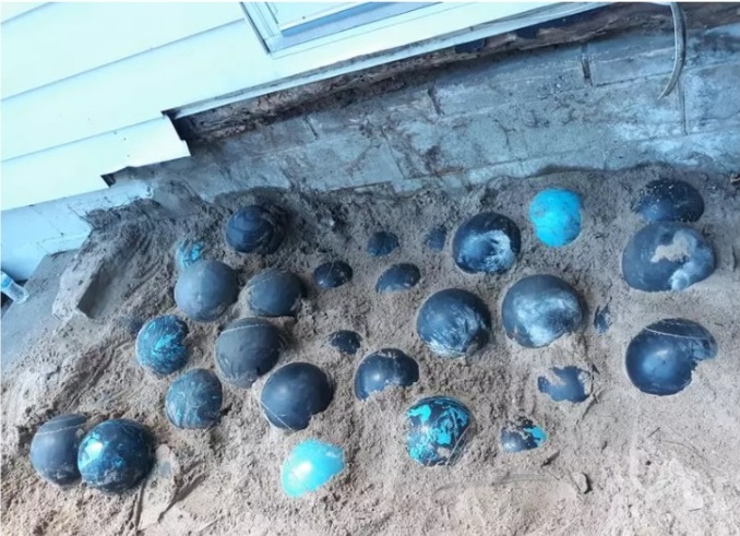 David disse que Brunswick confirmou que não havia perigo e o fez tirar fotos. Algumas bolas tinham números de série e gravuras que datavam da década de 1950, mesmo período em que a casa de Olson foi construída. No entanto, não está claro quando foram colocados sob a casa.
