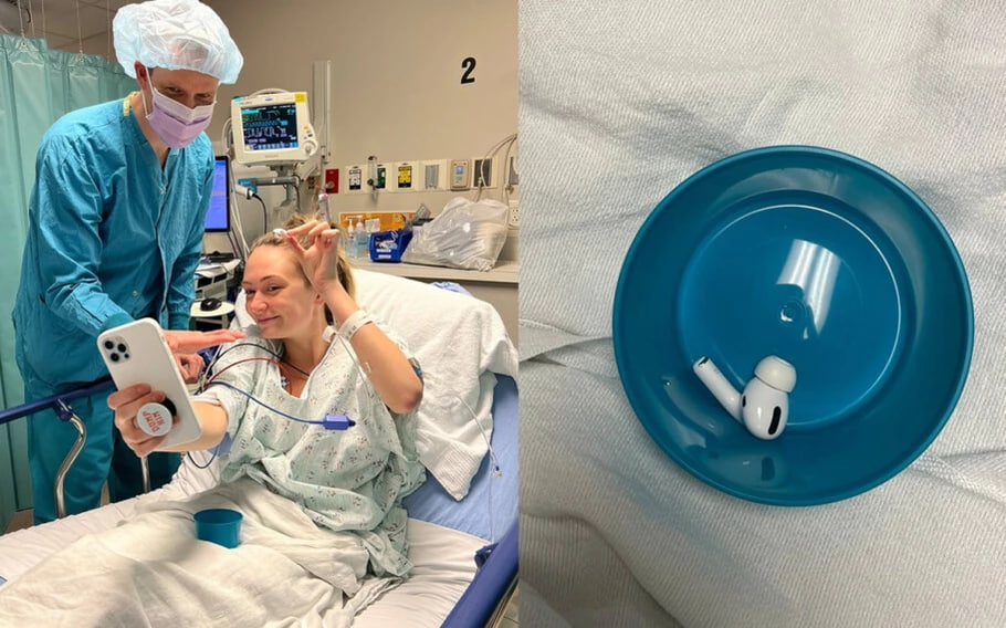 Quando acordou após o procedimento, a mulher encontrou o AirPod descansando em um copo, em seu colo.