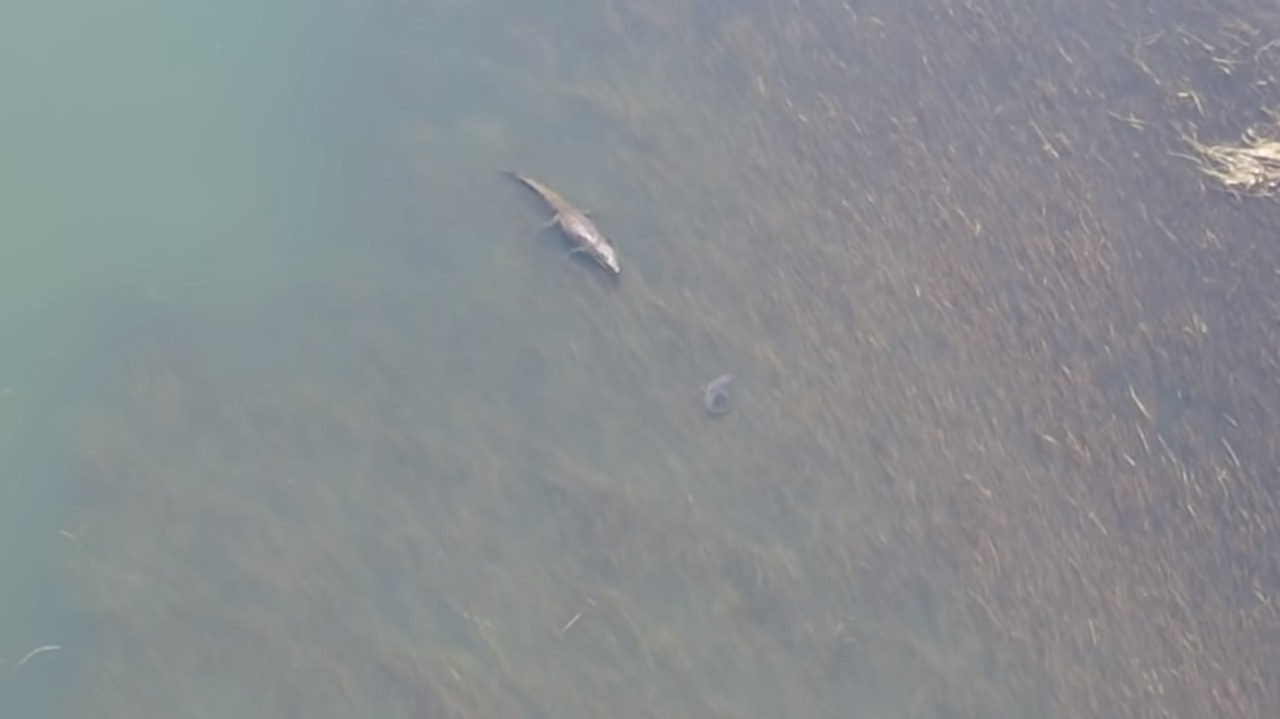 A perspicácia de um tubarão-touro ao mudar de rota para não encontrar um crocodilo-de-água-salgada, de mais ou menos cinco metros de comprimento, foi flagrada pelos youtubers do canal Caravan Aventura Aus, Chelsea Wood e Bryce Connole.