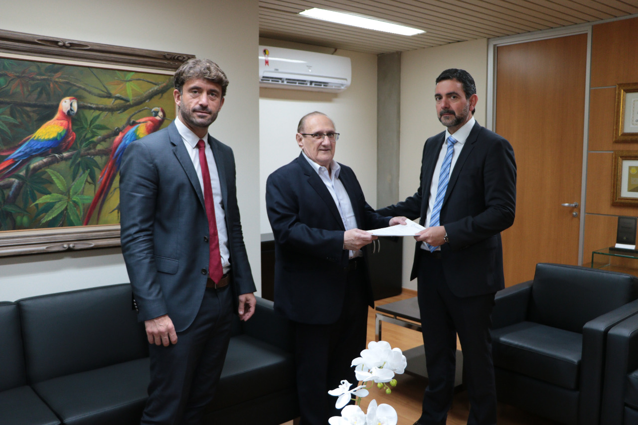O juiz auxiliar da presidência do TJMS, Fernando Cury, o Des. Paschoal Carmello Leandro, presidente do TJMS, e o juiz Eduardo Siravegna, presidente da Amamsul (Divulgação/assessoria)