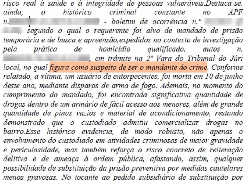 A Justiça de primeiro grau havia mantido a prisão preventiva, considerando o risco à ordem pública e a gravidade do caso. No acórdão do TJMS consta trecho do indeferimento de liberdade de Gabriel Garcia Ferreira, emitido pela 4ª Vara Criminal, primeira instância, que cita o seu suposto envolvimento no crime de homicídio.