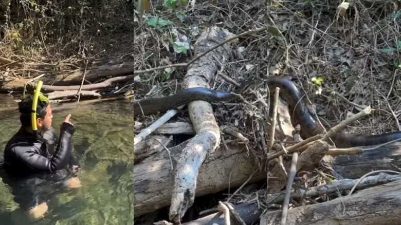 Nas imagens, a serpente aparece sobre a vegetação à beira do rio. Segundo Portilho, avistamentos desse tipo são mais comuns entre maio e setembro, período de seca em Bonito.
