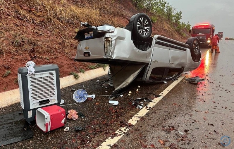De acordo com as informações preliminares, o veículo teria derrapado, saído da pista e, em seguida, capotado, resultando em graves danos à caminhonete. Com o impacto, pertences dos ocupantes ficaram espalhados pelo asfalto.