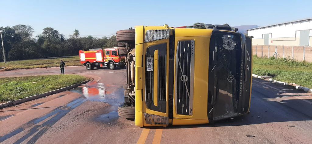 Na manhã deste sábado (22), o Corpo de Bombeiros atendeu um chamado com uma carreta boliviana de transporte de máquinas agrícolas tombada no Anel Viário, na BR-262, em Corumbá.