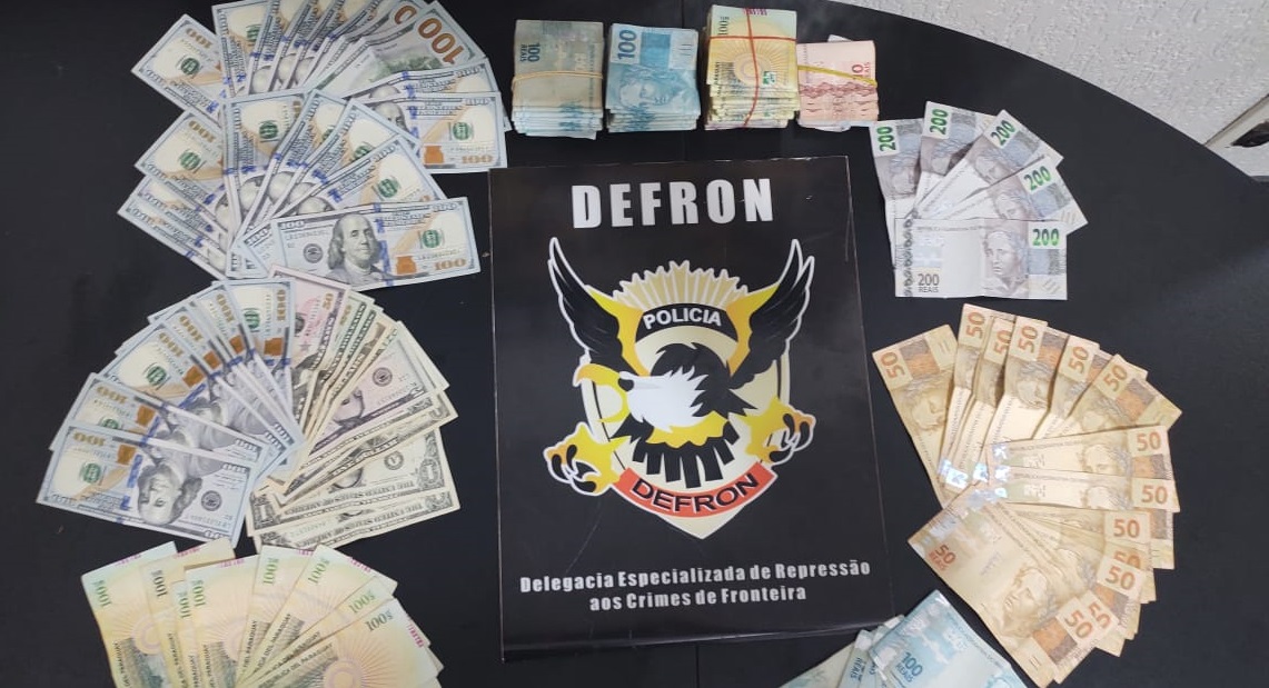 A Polícia Civil, através da Delegacia de Repressão aos Crimes de Fronteira (Defron), flagrou na tarde desta segunda-feira (21), um casal em posse de um total de R$ 20.126,00 reais, U$ 2.831,00 dólares americanos e 15.450.000 guaranis, perfazendo em moeda nacional, aproximadamente R$ 50.000,00. , em uma rodovia que dá acesso ao município de Laguna Carapã. O dinheiro não tinha origem lícita.
