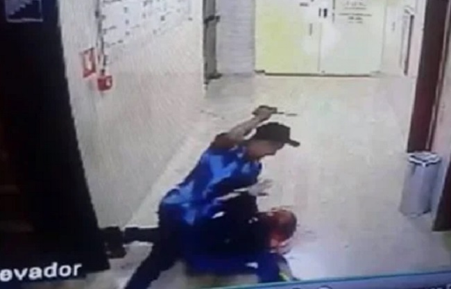 A mulher foi agredida em seu local de trabalho no último domingo (4). Nas imagens, é possível ver o homem à espreita da vítima. Quando avista o alvo, ele tira do bolso o objeto usado como arma, rende a ex-companheira e passa a desferir os golpes.