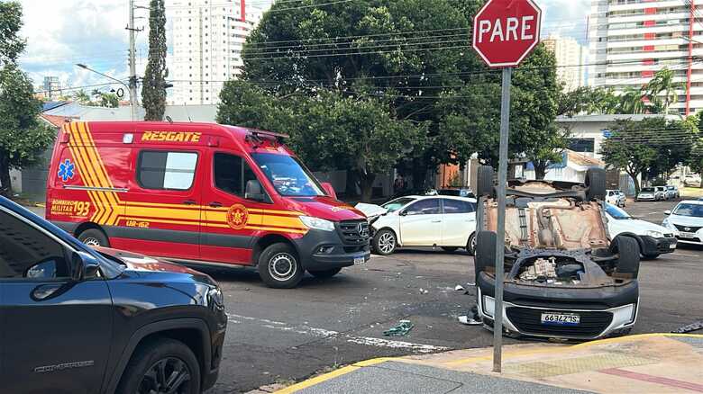 Uma colisão entre dois carros deixou um Tracker capotado e um Yaris com a frente destruída na tarde desta quarta-feira (8), na Rua Abrão Julio Rahe com a Rua Bahia, em Campo Grande.