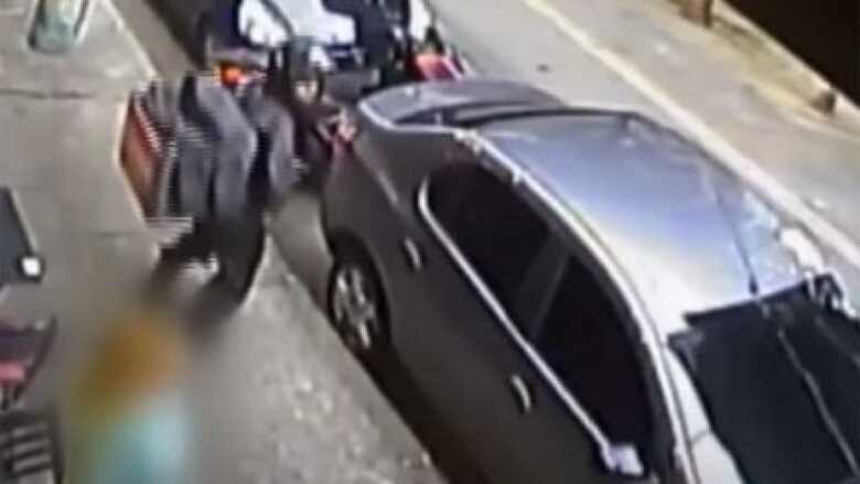 O caso aconteceu em uma zona nobre de São Paulo e o circuito de câmeras de segurança registrou a tentativa de assalto. Nas imagens, a vítima aparece na calçada, conversando com um amigo, quando o bandido, vestido de entregador de delivery, estaciona a moto e anuncia o assalto. Veja: