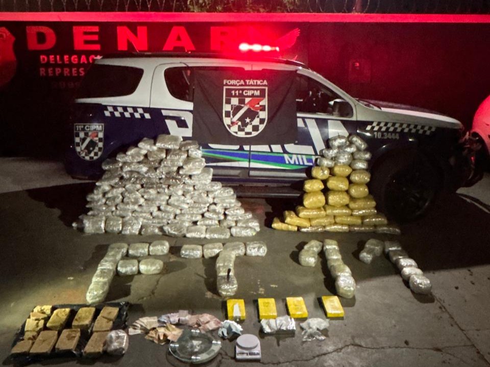 Ação da Força Tática da 11ª CIPM apreendeu mais de 100 kg de drogas em Campo Grande na noite de quinta-feira (5). A abordagem inicial ocorreu no bairro Vila Nasser, na região norte da cidade, e resultou na prisão em flagrante de um homem de 24 anos.