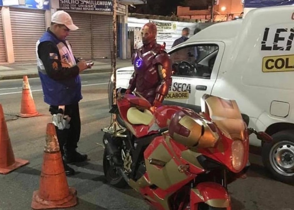 Um motociclista fantasiado de Homem de Ferro foi multado na noite do último sábado (25) por pilotar sem a Carteira Nacional de Habilitação (CNH), em Volta Redonda, Rio de Janeiro.