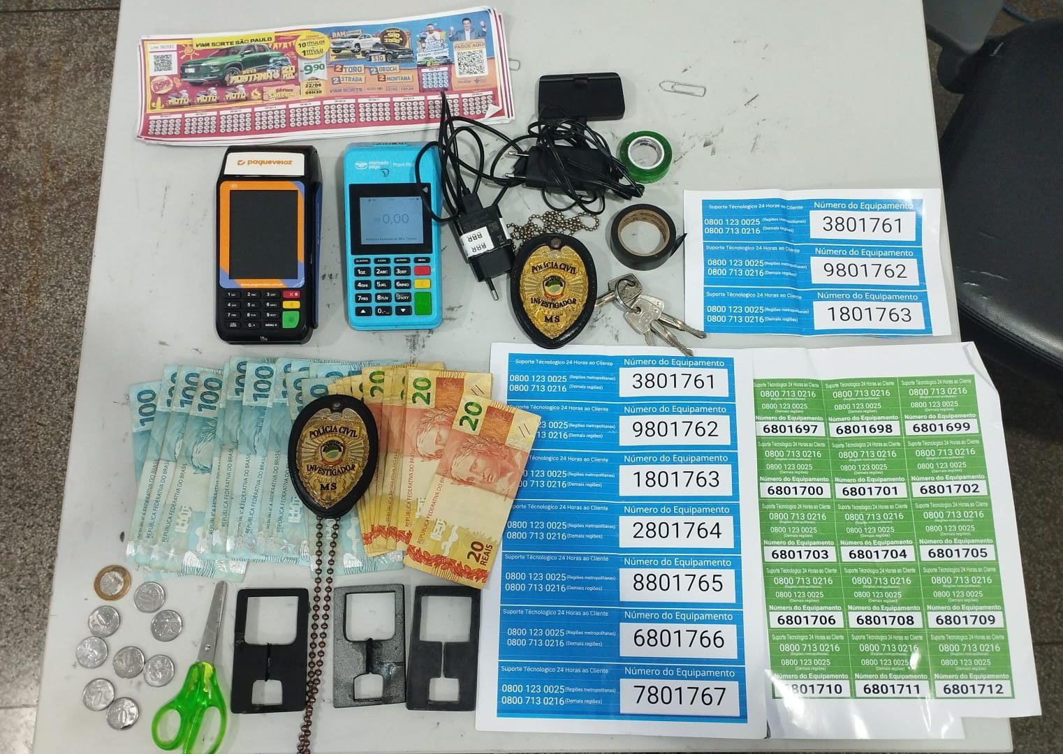 Com o suspeito, foram encontrados cartão de vítima, dinheiro e um dispositivo fraudulento. No hotel onde estava hospedado, a polícia apreendeu mais três “chupa-cabras”, máquinas de cartão, R$ 2 mil em espécie e adesivos com números falsos de suporte técnico, usados para enganar os clientes.