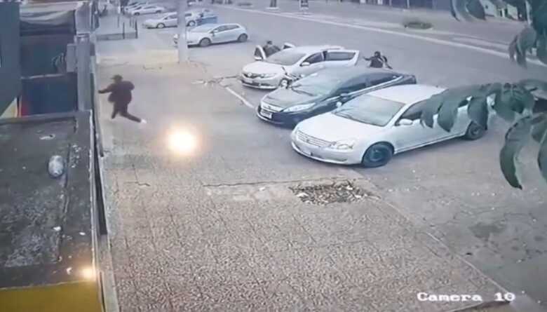 Pelo video é possível notar que quatro pessoas armadas a bordo de um carro, esperam a vítima sair do local. O homem, porém, percebe a presença do grupo e consegue se livrar do ataque.