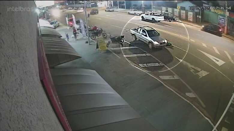 Imagens de câmera de segurança de um estabelecimento comercial flagraram o momento em que houve o atropelamento e a fuga do motorista, até o momento não identificado. Ele conduzia uma Fiat Strada.