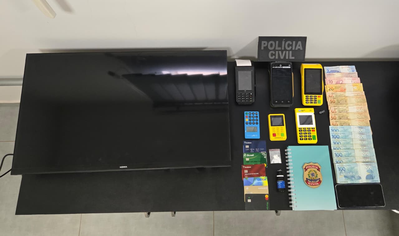 Durante as diligências, foi localizado o imóvel utilizado pelas investigadas, onde foram apreendidos: diversos cartões bancários de terceiros; caderno com dados bancários de várias vítimas; substância análoga à cocaína; seis máquinas de cartão; milhares de reais em espécie; televisor sem procedência; medicamento de uso controlado (clonazepam), que possui efeito sedativo.