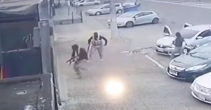 Conforme as imagens, o rapaz estava saindo do serviço quando percebe que estava sendo aguardo por quatro homens dentro de um carro. Vendo a movimentação suspeita, ele não pensa duas vezes e corre para dentro da boate novamente.