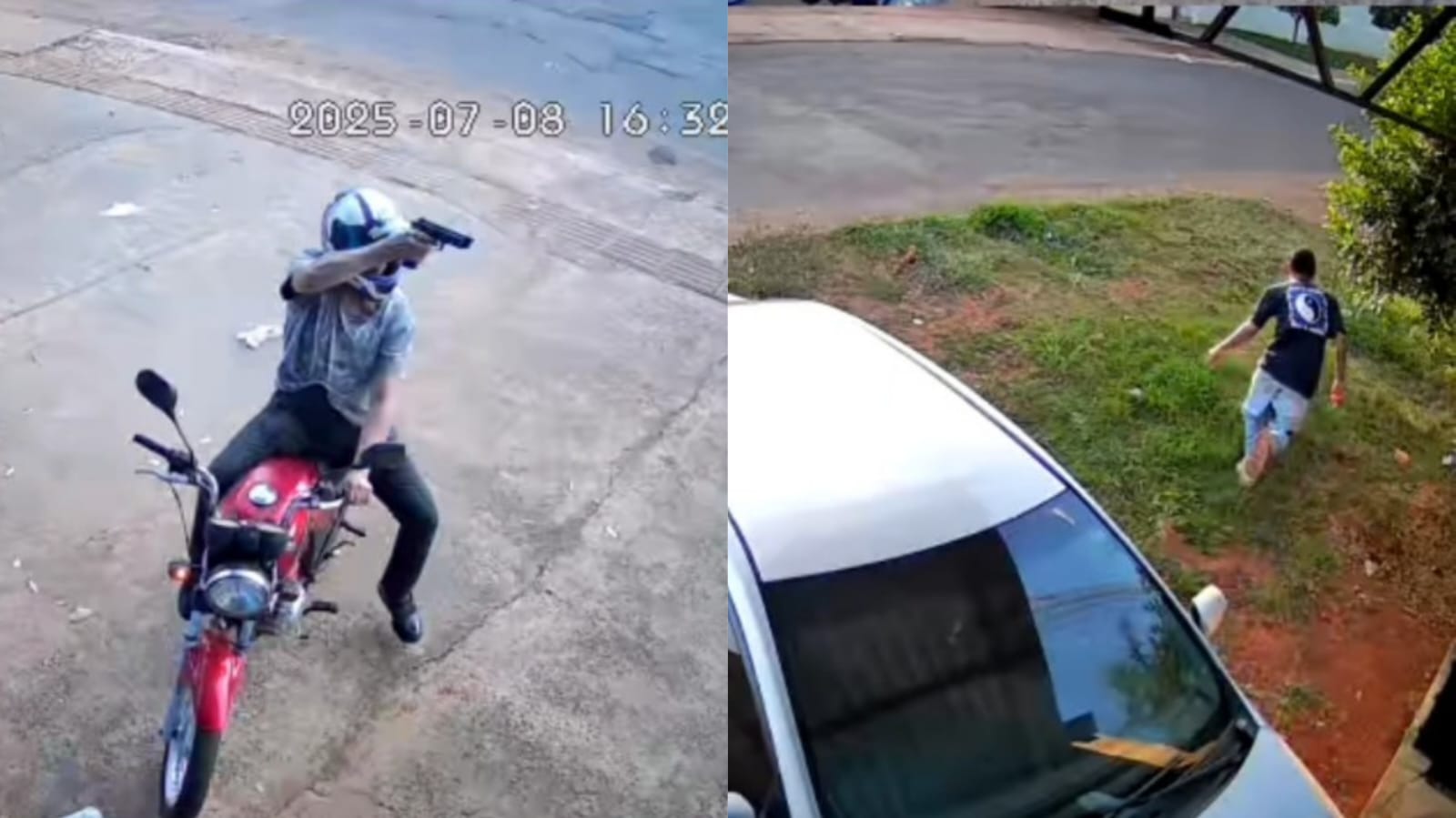Nas imagens de câmera de segurança, o caso aconteceu por volta das 16h32, quando a vítima aparece correndo pela via e logo na sequência, o motociclista também surge e com a arma em punho.