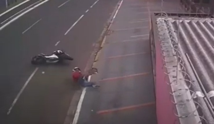 Um vídeo registrado por câmeras de segurança mostra o motociclista de cerca de 28 anos derrapando na pista após cair na Avenida Fábio Zahran, próximo a pousada Ipacaraí, na Vila Ipiranga na manhã deste sábado (13).
