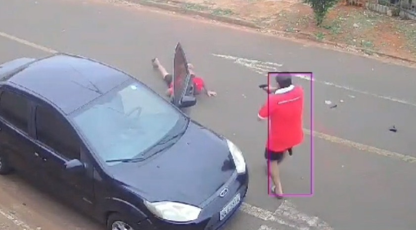 Imagens de câmera de segurança mostram a briga entre um policial militar e um barbeiro, de 37 anos, na rua Miguel Ângelo, localizada no Bairro Aero Rancho, em Campo Grande, que aconteceu na tarde de terça-feira (24).