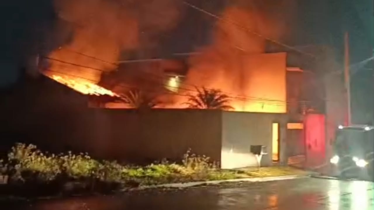 As chamas ficaram altas e puderam ser vistas de longe. Um morador chegou próximo à casa e registrou os momentos de tensão e de trabalho do Corpo de Bombeiros.