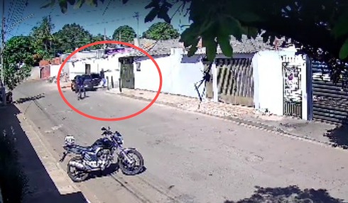 Imagens de câmeras de segurança mostram o momento que o Volkswagen Gol azul passa atirando contra dois homens, identificados como Kelvin (traficante) e Papaléguas (usuários de drogas), na Travessa Brisa, localizada na Vila Nhanhá, em Campo Grande.